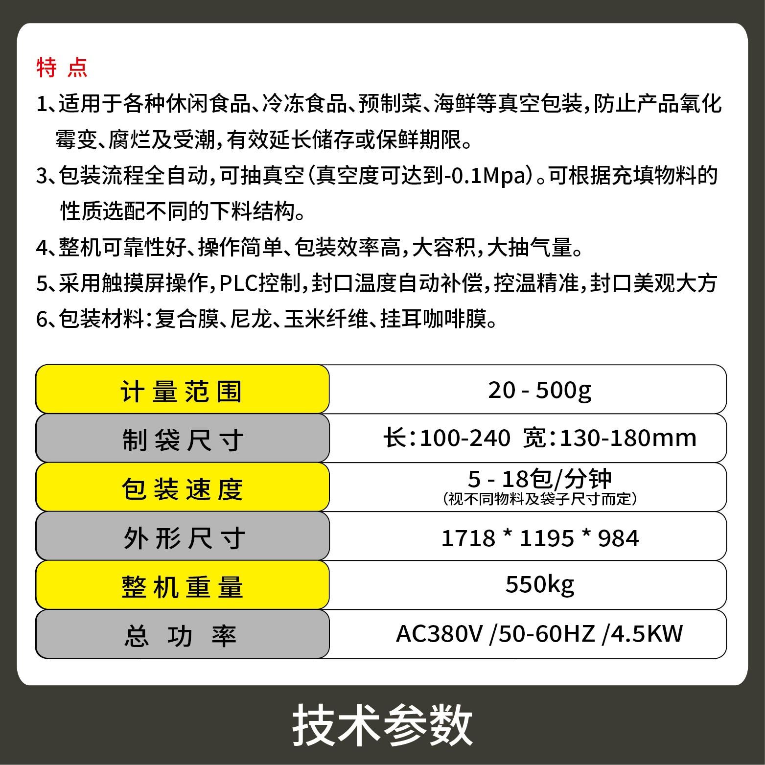 The packaging process is fully automatic and can perform vacuum pumping (with a vacuum degree up to -0.1Mpa). Different feeding structures can be selected according to the nature of the filled materials.